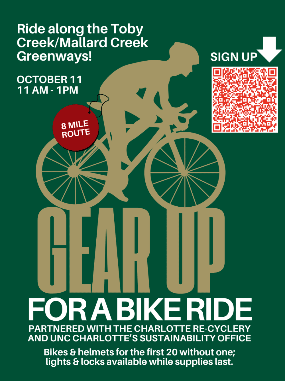 Join two Sustainability Ambassadors and the Charlotte Re-Cyclery for an ~8-mile group bike ride down Toby Creek and Mallard Creek Greenways! Click here to view the route map.