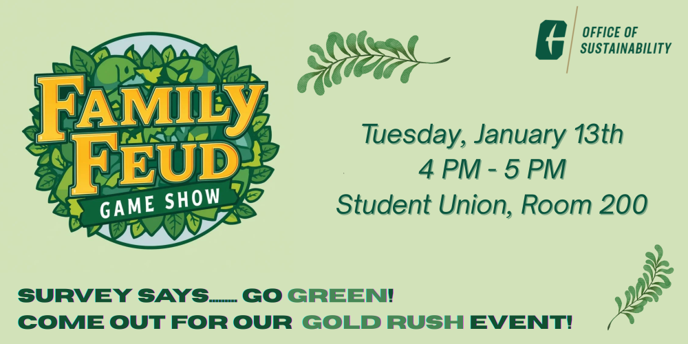 Join the Office of Sustainability for a sustainability-themed family feud as part of Gold Rush Spring 2026! Participants will be split into teams (or “families”) to guess the most popular answers to sustainability-themed questions. Prizes will include hiking bags and other camping gear. You will be assigned a team when you arrive at the event.
