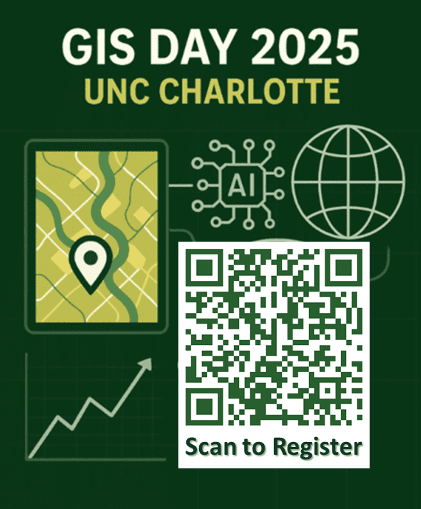 The Center for Applied GIScience (CAGIS) invites students, faculty, companies, and organizations to celebrate GIS Day 2025, a global event recognizing the transformative power of Geographic Information Systems (GIS). The theme of this year highlights the power of Geospatial Artificial Intelligence (Geospatial AI) is shaping a more connected, sustainable, and resilient future. Free pizza will be provided for attendees who registered and vote for competitions!